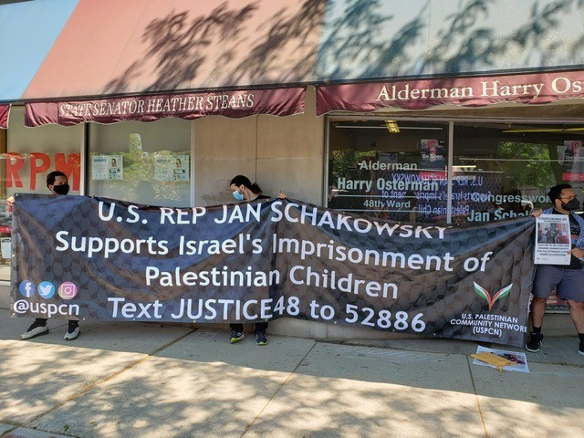 ويضم تحالف شيكاغو ضد العنصرية مؤسسات فلسطينية، ضمنها شبكة الجاليات الفلسطينية، رافعين لافتة كبيرة أمام مكتب عضو الكونغرس كتب عليها "عضو الكونجرس شاكوسكي يؤيد اعتقال الأطفال الفلسطينيين".