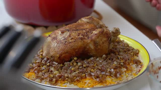 يسكب الارز بصحن التقديم ونوزع الارز الملون بالزعفران على الوجه ثم نوزع باقي الحشوة وفوقها الدجاجة