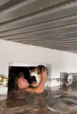 وانتشر مقطع الفيديو للشاب الأمريكى ويدعى سيرجيو جارسيا، وهو ينزل إلى قبو المنزل ثم يخرج القطة بعد أن سمع صوت استغاثتها، ليخرجها من المكان المملوء بالمياه ويسلمها لصاحبها الذي شكر جارسيا على بطولته وعدم خوفه من المياه التي تغطى المبنى ولاسيما الطابق السفلى منه، وفق ما نقلته وكالة سبوتنيك الروسية.