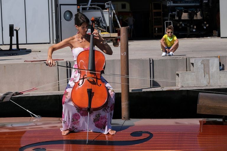وانطلقت على متنه، الجمعة، أنغام موسيقى عزفتها فنانة على آلة التشيلو.