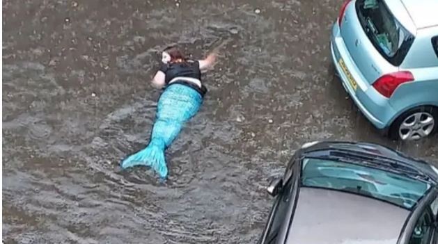 ترك السكان في وسط جلاسكو الاسكتلندية حالة الفوضى التي عمت المدينة جراء الأمطار الغزيرة التي ضربتها بداية الأسبوع الجاري، وتحول تركيزهم لمتابعة مشهد مذهل وطريف لفتاة ترتدي ازياء  حورية بحر تحاول السباحة وسط أحد الشوارع التي غمرتها المياه.