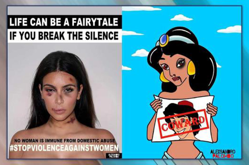 الفنان والناشط ألكساندرو بالومبو، أعاد تحرير صور كيم كاردشيان بعد تعرضها للعنف، لكن من مخيلته هذه المرة، ونشر صورها على حسابه على موقع التواصل الاجتماعي (فيسبوك) رفقة صور نجمات هوليود، ضمن حملة للقضاء على العنف المنزلي.