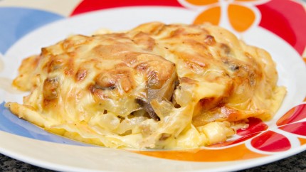 صدر دجاج منزوع الجلد والعظام ومغسول – 8 حبهان – ملعقة كبيرة فلفل أبيض – ملعقة صغيرة قرفة – 3 أعواد فطر معلب – 400 غرام بصل مفروم – 2 ثوم مهروس – 3 فصوص صلصة البشاميل – نصف ليتر جبن شيدر مبشور – ربع كوب فلفل أسود مطحون – نصف ملعقة صغيرة جوزة الطيب – نصف ملعقة صغيرة ملح – ملعقة صغيرة زيت نباتي – 3 ملاعق كبيرة ماء – بحسب الحاجة