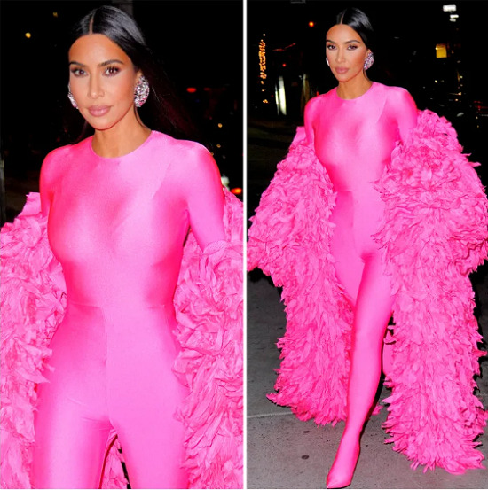 اختارت كيم زيًا من قطعة واحدة من Balenciaga تم تصميمه من قماش سبانديكس شديدة اللمعان، كان زيها عالقا بحذاء مدبب وردي اللون، استكملت اطلالاتها بمعطف من الريش بلون وردي مطابق، وصمم بشكل يلامس الأرض، مع أقراط دائرية لامعة.
