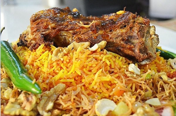 9- اخرجي اللحم، قلبي الأرز ليتوزع الزعفران، ضعيه في طبق التقديم، وزعي اللحم فوق الأرز. قدميه ساخنا.