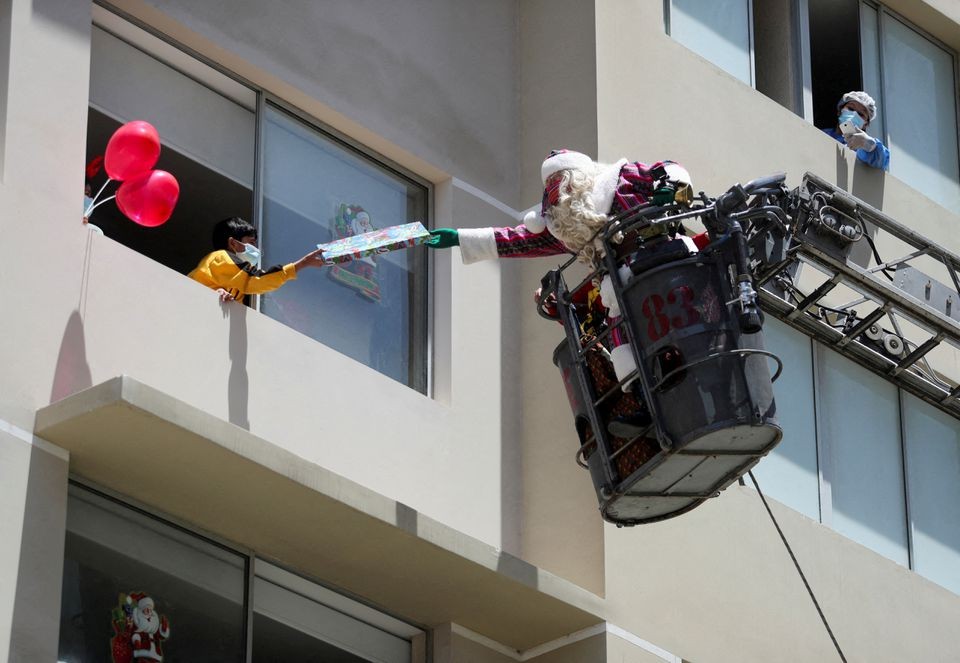 في بيرو، استخدم سانتا سيارة إطفاء وتم رفعه في عربتها لتقديم فرحة عيد الميلاد والهدايا للأطفال المصابين بـ COVID-19 الذين يعزلون من عائلتهم في مستشفى المدينة.