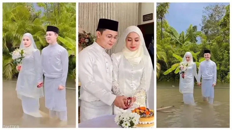 وأشعل زوجان من ماليزيا الإنترنت، عندما ظهرا بلقطات وهم يقومان بطقوس الزفاف التقليدي، وسط مياه مرتفعة تصل للركبة، جراء الفيضانات، بينما اعتلت وجهيهما ابتسامتان عريضتان.