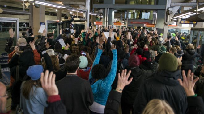 تجمهر مئات المتظاهرين أمام مطار سانت بول في مدينة مينيابولس الامريكية ومنعوا رواد المطار من الدخول أو الخروج احتجاجا على قيام الشرطة بقتل فتى أسود.