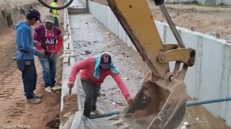 وخلال لحظات، هبطت ذراع الجرافة بالعامل إلى قلب المجرى المائي، وبدا وكأن العامل في مهمة عمل، قبل أن يظهر من بعيد كلب على قيد الحياة تدفعه المياه السريعة.