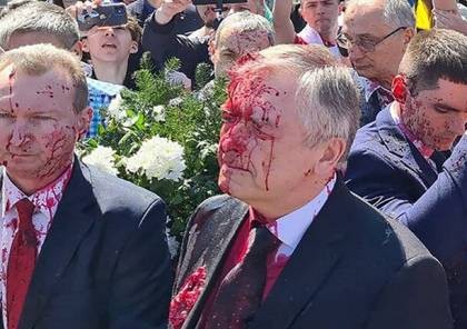 وبحسب وسائل إعلام دولية، رشق متظاهرون السفير الروسي سيرغي أندرييف وزوجته ودبلوماسيين مرافقين له بالطلاء الأحمر ولم يسمحوا لهم بالاقتراب من النصب التذكاري.