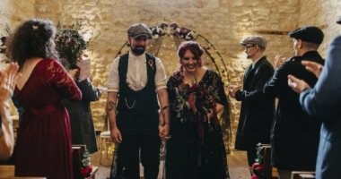 ارتدت جودي ، 28 عامًا ، فستان زفاف أسود أثناء سيرها في حفل زفافها وأكملت إطلالتها بارتداء حذاء بكعب أحمر ليناسب شعرها القرمزي ، بينما زوجها ماثيو ، 25 عامًا، ورفقاؤه ارتدوا سترات وقبعات مسطحة، و تميز ديكور الحفل بمجموعة من جماجم غير حقيقة، وشموع عائمة وفراشات مزيفة وبتلات زهور مجففة معظمها من تصميم العروس.