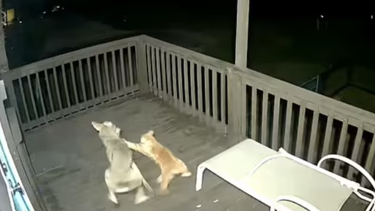 وشارك توني غراي، المقيم في تكساس، لقطات من "المعركة"، رصدتها كاميرا مراقبة على شرفة منزله في شاطئ سورسايد، حيث يمكن رؤية ذئب يشحن من قطة، ويحاول الإمساك بها، فيما تواجهه وتختبئ بسرعة تحت كرسي الشرفة، في حين يواصل محاصرتها، لتتسلق درابزين الشرفة، وتتعلق به ما دفع الذئب للرحيل، وتنزلق بعدها لخارج الشرفة.