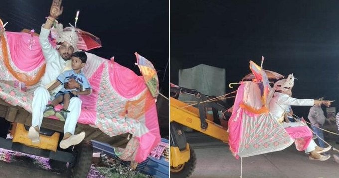 وفرضت شرطة ولاية ماديا براديش غرامة قدرها 5000 روبية على سائق الجرافة بعد أن حمل العريس بها، ووقع الحادث في منطقة بيتول بولاية ماديا براديش يوم الثلاثاء.