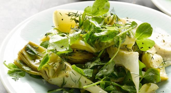 3. ضعي قطع الخرشوف في طبق التقديم، ثم اسكبي فوقها مزيج الليمون وزيت الزيتون، ثم ضعيها في الثلاجة حتى تبرد السلطة، ثم قدميها.
