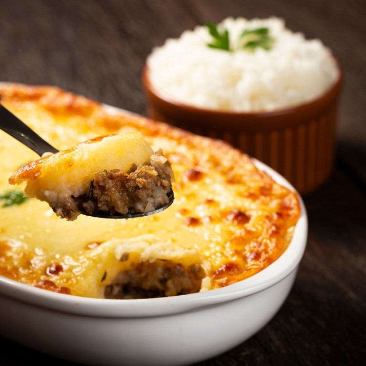 في قالب تارت مدّي عجينة البطاطس، ثم وزعي خليط اللحم مع تصفيته من الماء جيداً فوق عجينة البطاطس، ثم رشّي جبن الموزاريلا على الوجه ووزعيها جيداً.