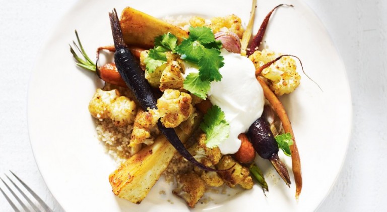 5 – وزعي الكسكسي في أطباق التقديم وأضيفي إليه الخضار المشوية وزينيه بالكزبرة وملعقة من الزبادي ثم قدميها.