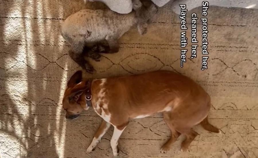 كلب مزرعة محب انجذب وتعاطف مع حمل صغير، حيث قام بتربيته لرفض أمه له معتبراً إياه أنه ملكه.