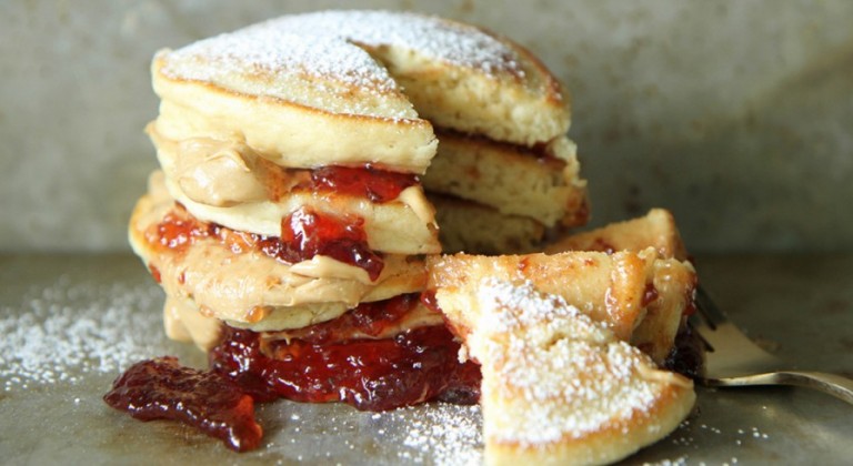 7 – قدمي البان كيك ساخناً مع زبدة الفول السوداني والجيلي ورشيه بالقليل من السكر البودرة.