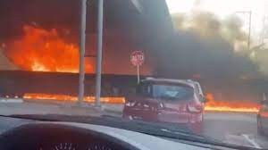 تداولت مواقع التواصل الاجتماعي مقطع فيديو، يظهر قطار شحن في المكسيك يمر وسط نيران كثيفة، بعد أن اصطدمت شاحنة وقود بالجسر الموجود فوق سكة الحديد.