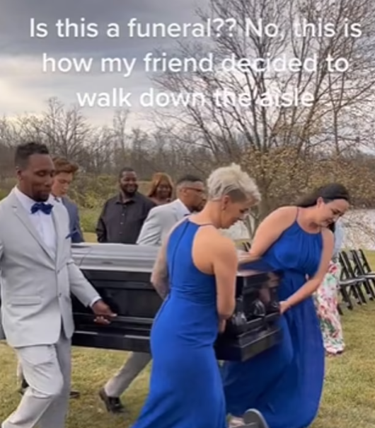 وقال ناشر الفيديو: "هل هذه جنازة؟.. لا، هذه هي الطريقة التي قرر بها صديقي السير في الممر"، وفي الفيديو، شوهدت وصيفات الشرف والعديد من رفقاء العريس وهم يسحبون تابوتًا أسود من سيارة كبيرة.