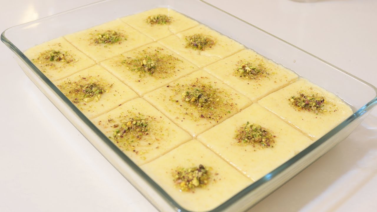 • نخرج الصينية من الثلاجة ونزيّن بالفستق الحلبي. نقدّم الحلى بارداً. ألف صحة!