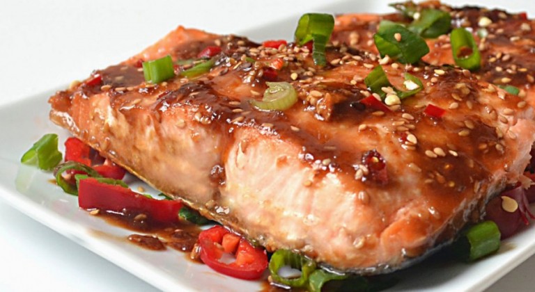 5 – قدمي فيليه السلمون مع بعض الصلصة وزينيه بالبصل الأخضر والفلفل الحار.