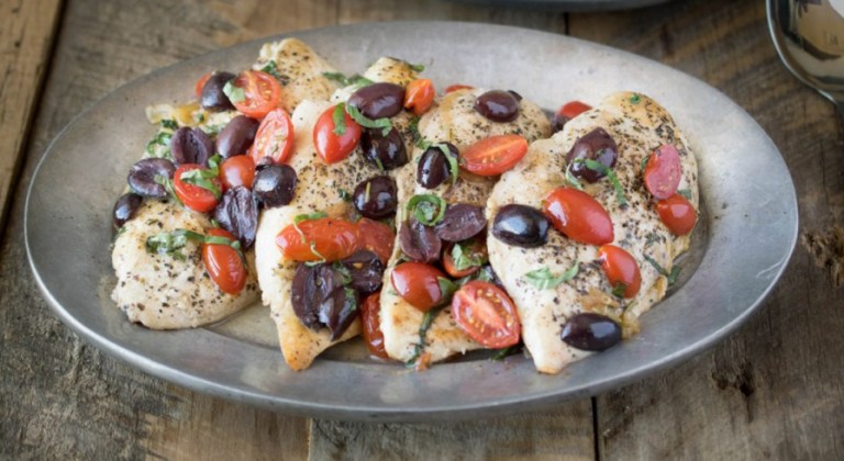 7 – قدمي شرائح صدور الدجاج والطماطم والزيتون.