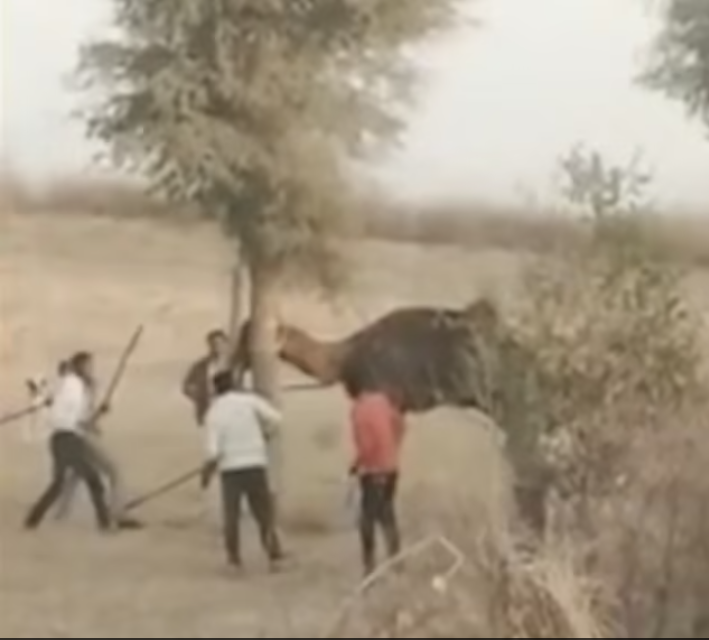 الجمل أمسك صاحبه من رقبته، وألقاه على الأرض وبدى وكأنه يمضغ رأسه، وفي مقطع فيديو انتشر على الإنترنت، ربط ستة أشخاص الجمل فى شجرة وضربوه بالعصيان حتى الموت، منتصف الأسبوع الماضى.
