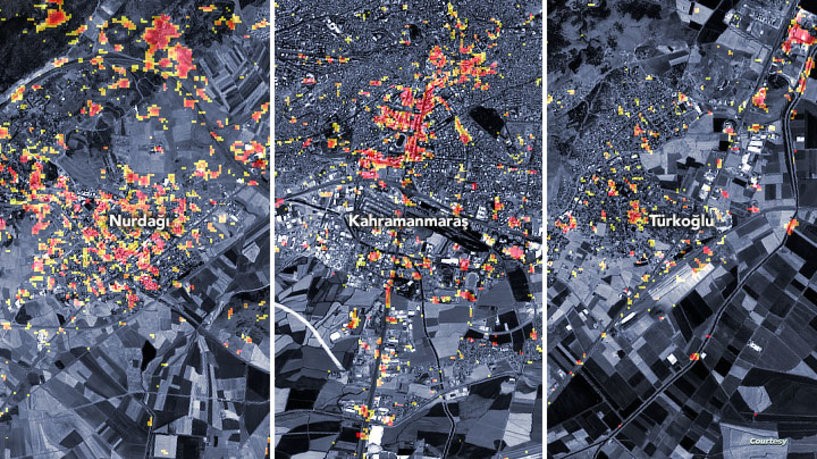 وتُظهر الصور، التي نشرها مرصد الأرض التابع لناسا، الأضرار التي لحقت بثلاث مدن تركية، هي كهرمان مرعش وتوركوغلو ونورداغي.