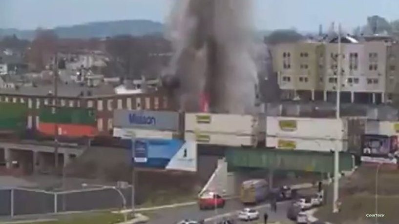 وأظهر مقطع مصور عرضته قناة )دبليو.تي.إكس.إف( التلفزيونية، اليوم السبت، تصاعد ألسنة اللهب وأعمدة الدخان والغبار والحطام إلى السماء.