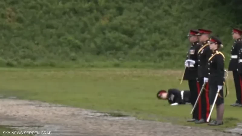 وكان الجندي جزءا من حدث في قلعة كارديف في ويلز، عندما سقط فجأة إلى الأمام على وجهه في التراب، وهي لقطة أظهرتها فيديوهات انتشرت .