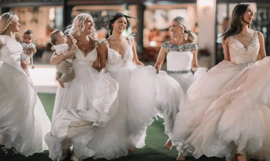 أمريكية وبناتها خرجن لتناول العشاء بفساتين زفافهن بصحبة أطفالهن