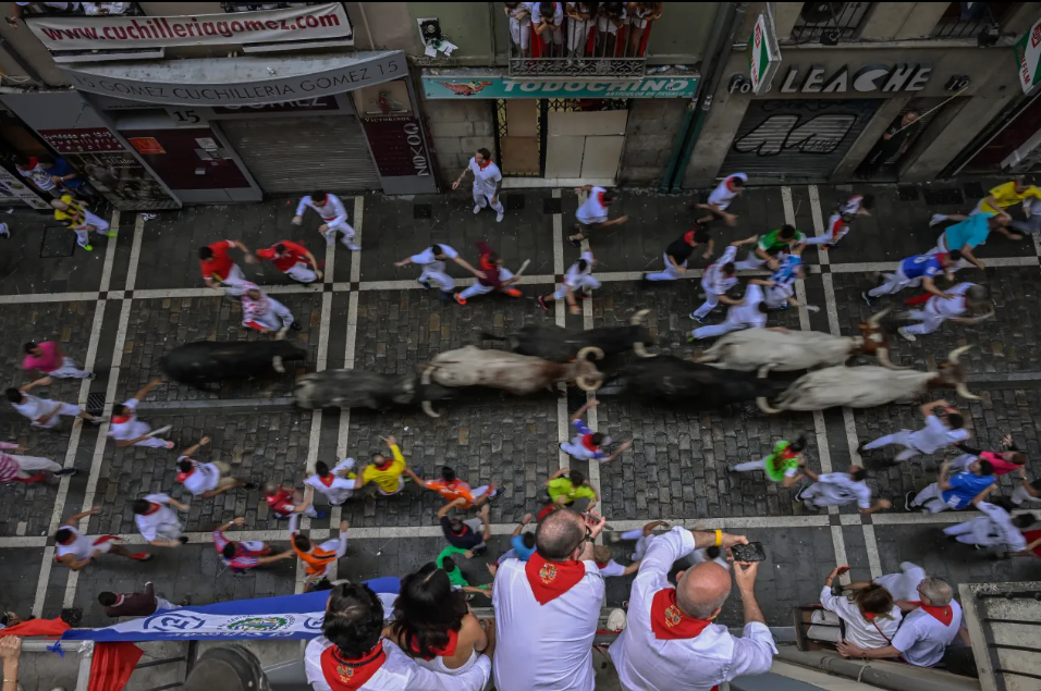 شارك الآلاف من الباحثين عن الإثارة فى السباق الأول للثيران في مهرجان سان فيرمين في مدينة بامبلونا شمال إسبانيا، فيما تعرض عدد كبير من العدائين للضرب والسقوط أمام الثيران، كما أصيب بعضهم بإصابات خفيفة، لكن لم يصب أحد منهم بأذى شديد، وهي سمة متكررة للمشهد: