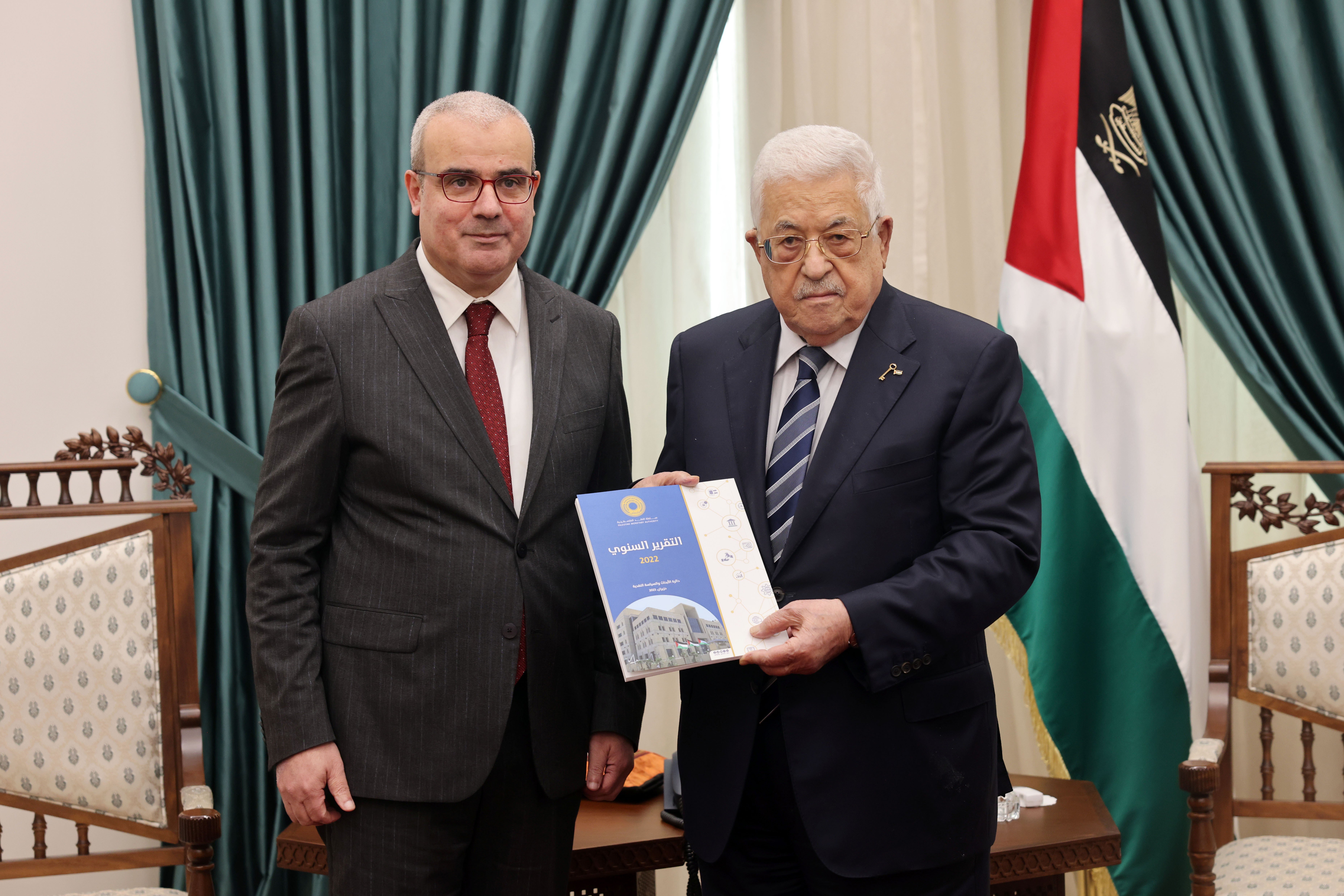 تسلم الرئيس محمود عباس، مساء اليوم الثلاثاء، التقرير السنوي لسلطة النقد الفلسطينية عن عام 2022.