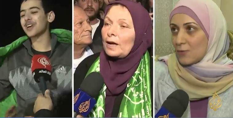 وابتهج الفلسطينيون أمس الجمعة بعودة الأسرى الذين أفرجت عنهم إسرائيل بموجب الاتفاق، كما حصل في بيتونيا ومخيم نابلس للاجئين، حيث استقبلت حشود كبيرة الأسرى الفلسطينيين عند نزولهم في بيتونيا، وهتف كثير منهم "الله أكبر"، وأطلقت مفرقعات نارية أضاءت أجواء المكان، ورفع المشاركون عددا من المفرج عنهم على أكتافهم ولوحوا بأعلام فلسطين. في حين حظرت إسرائيل أي احتفال في القدس الشرقية.