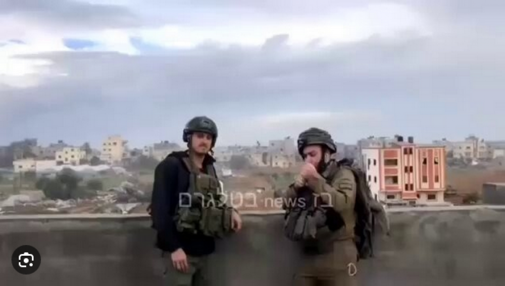وأظهرت لقطات الفيديو الجنديان وهما يقفان على سطح بناية، أثناء تفجير عدد من المنازل بطريقة ساخرة.