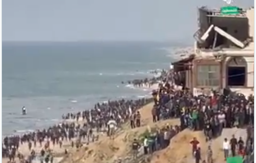 وأظهرت مقاطع مصورة تم تداولها عبر منصات التواصل الاجتماعي مواطنين فلسطينيين يحتشدون على ساحل البحر في محاولة للحصول على بعض صناديق المساعدات التي ألقيت بواسطة مظلات.