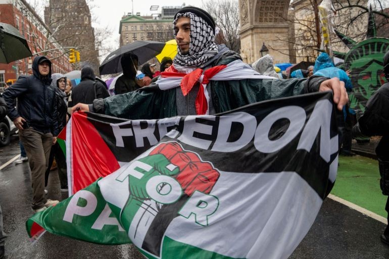 وقد تجمع آلاف الأميركيين في ميدان واشنطن بحي مانهاتن في مدينة نيويورك، للمطالبة بوقف الحرب والدعم الأميركي لإسرائيل بجميع أشكاله.