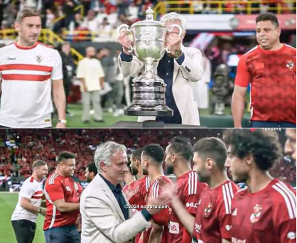 وكتبت الشبكة على الصورة: "أحضر جوزيه مورينيو الكأس قبل النهائي بين الأهلي والزمالك". وأضافت: "انضم إلى مورينيو، كل من الظاهرة رونالدو بقميص الأهلي، وفرانشيسكو توتي بقميص الزمالك".