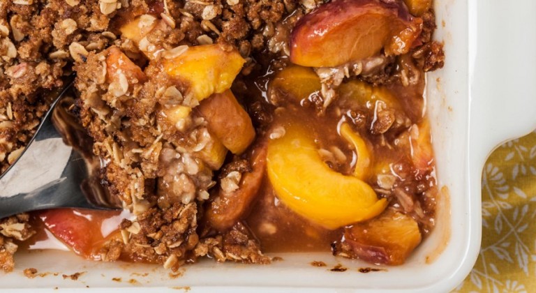 2 – انقلي خليط الطبقة الأولى إلى صينية الخبز، ثم أضيفي إليها خليط الخوخ، وأدخليها الفرن مدة 20 إلى 25 دقيقة، ثم أخرجيها من الفرن واتركيها تبرد 30 دقيقة قبل التقديم.