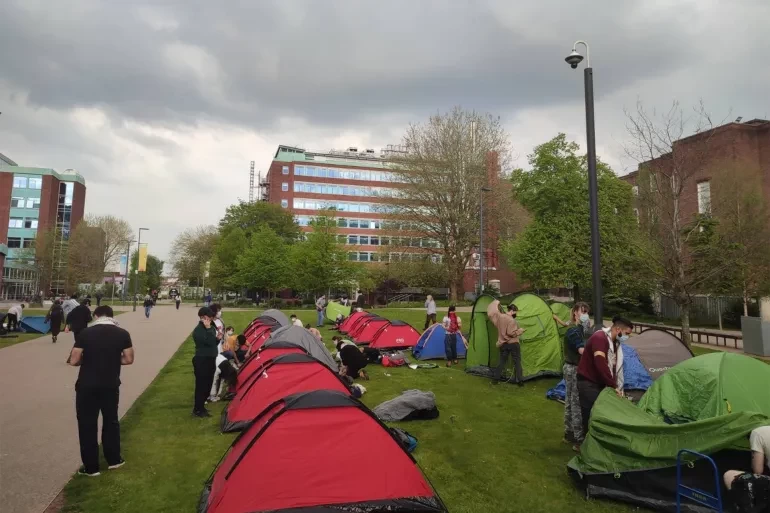 أعلن طلاب في جامعة أدنبرة ووارويك ومانشستر انضمامهم لحراك التخييم الجامعي، على غرار ما يجري في الولايات المتحدة، تضامنا مع غزة في مواجهة الحرب الإسرائيلية المستمرة منذ حوالي 7 أشهر. وقال طلاب مشاركون بالحراك من جامعة مانشستر -في رسالة إلكترونية تلقتها الجزيرة نت- إنهم لن يغادروا المخيم قبل تلبية طلباتهم.