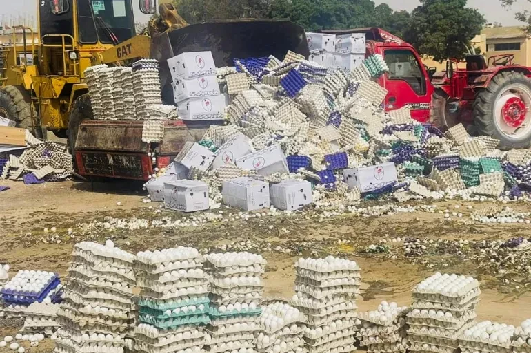 وقال مسؤولون محليون من وزارة التموين المصرية إن بعض المواد الغذائية تباع بأسعار منخفضة في السوق المحلية بشمال سيناء مما أدى إلى مصادرة كميات من البيض الفاسد.