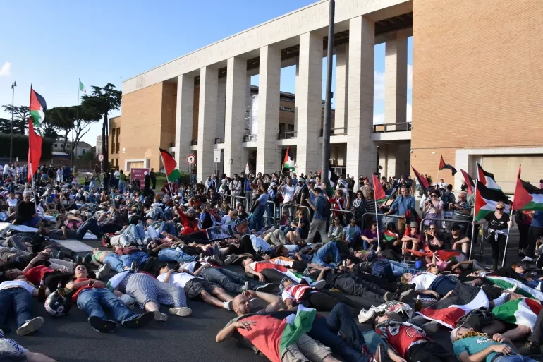وتجمع حوالي ألفي شخص عند مدخل جامعة سابينزا في روما احتجاجا على هجمات إسرائيل في رفح وغيرها من مناطق قطاع غزة.