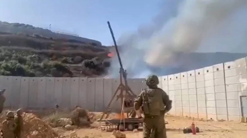 ويظهر في الفيديو جنود الاحتلال الإسرائيلي وهم يقفون خلف الجدار الفاصل بين لبنان وإسرائيل ويستخدمون منجنيقا لإلقاء قذائف اللهب على لبنان.