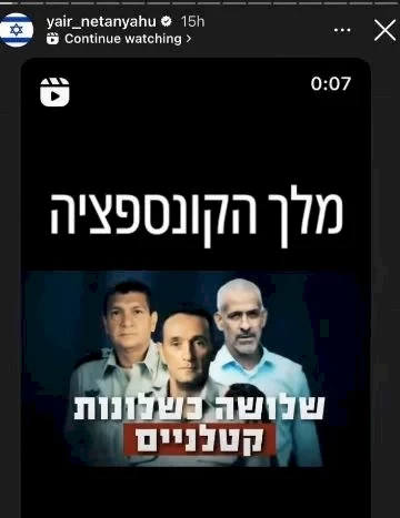 وبحسب موقع صحيفة يديعوت أحرونوت، فإن نجل نتنياهو نشر على "القصص" في حساباته عبر شبكات التواصل الاجتماعي، صورة تجمع رئيس أركان الجيش الإسرائيلي هيرتسي هاليفي، ورئيس الشاباك رونين بار، ورئيس الاستخبارات العسكرية المستقيل حديثًا أهارون حاليفا، وكتب أسفلها "الاخفاقات الثلاثة القاتلة".