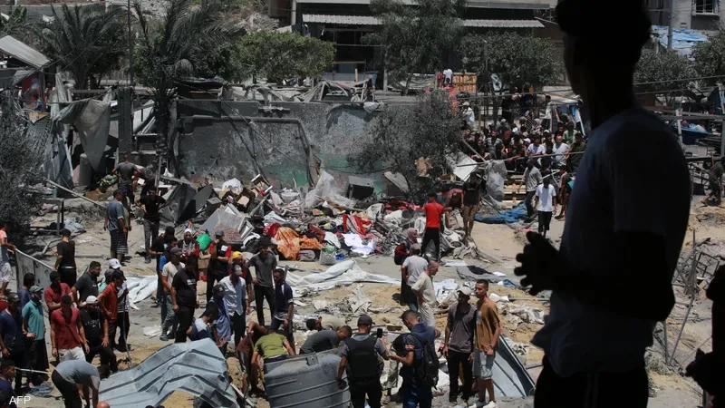 وتسببت الغارة التي نفذتها إسرائيل في حفرة كبيرة تناثرت فيها حطام خيام ومبنى مدمر في خان يونس.