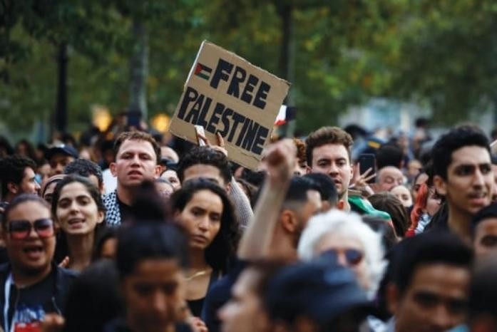 تظاهر طلاب في جامعة كولومبيا بولاية نيويورك الأميركية، في اليوم الأول من العام الدراسي الجديد تنديداً باستمرار العدوان على قطاع غزة، واستنكاراً لرفض إدارة الجامعة مطالبهم بسحب استثماراتها من الشركات الاسرائيلية والشركات الداعمة لدولة الاحتلال .