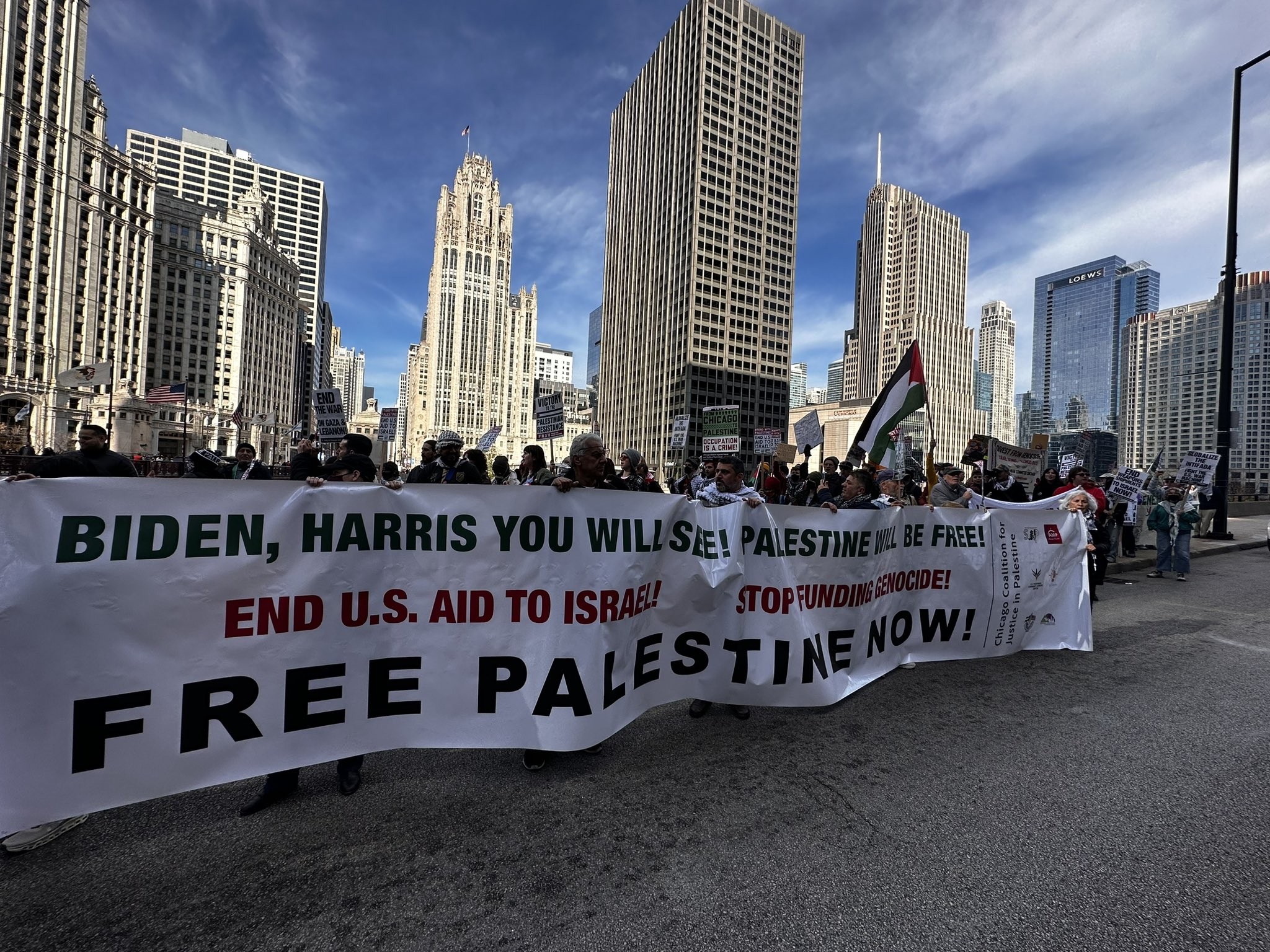 وردد المشاركون في المسيرة الهتافات المنددة بالانحياز الأميركي للاحتلال الإسرائيلي منها: "عدم التصويت في الانتخابات الرئاسية للإبادة الجماعية" في إشارة إلى الدعم اللامحدود الذي قدمته الإدارة الأميركية الحالية لدولة الاحتلال في المجالين العسكري والمالي ما أطال عمر الحرب وقتل المزيد من الأبرياء.