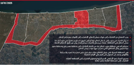 نشر جيش الاحتلال "الإسرائيلي"، اليوم السبت، بياناً توضيحياً عاجلاً إلى سكان قطاع غزة بخصوص دخول اتفاق وقف إطلاق النار حيز التنفيذ اعتباراً من صباح غدٍ في تمام الساعة 08:30 لتفادي الاحتكاكات وسوء الفهم.