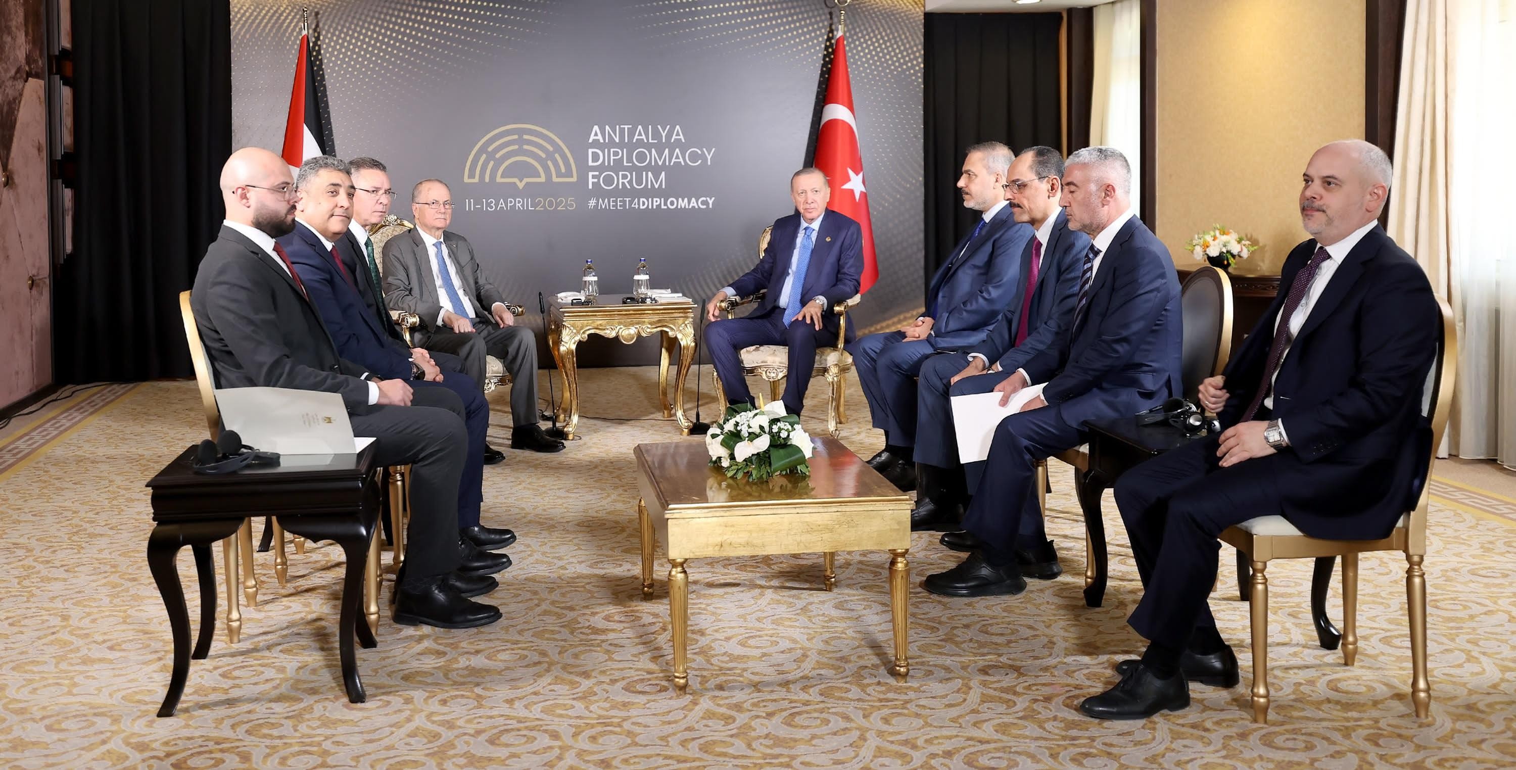 التقى رئيس الجمهورية التركية رجب طيب أردوغان، اليوم السبت، مع رئيس الوزراء، وزير الخارجية محمد مصطفى، بحضور وزير الخارجية التركي هاكان فيدان، وسفير دولة فلسطين لدى تركيا فائد مصطفى، ومساعد وزير الخارجية السفير عمر عوض الله، على هامش مشاركته في منتدى أنطاليا للدبلوماسية بنسخته الرابعة.